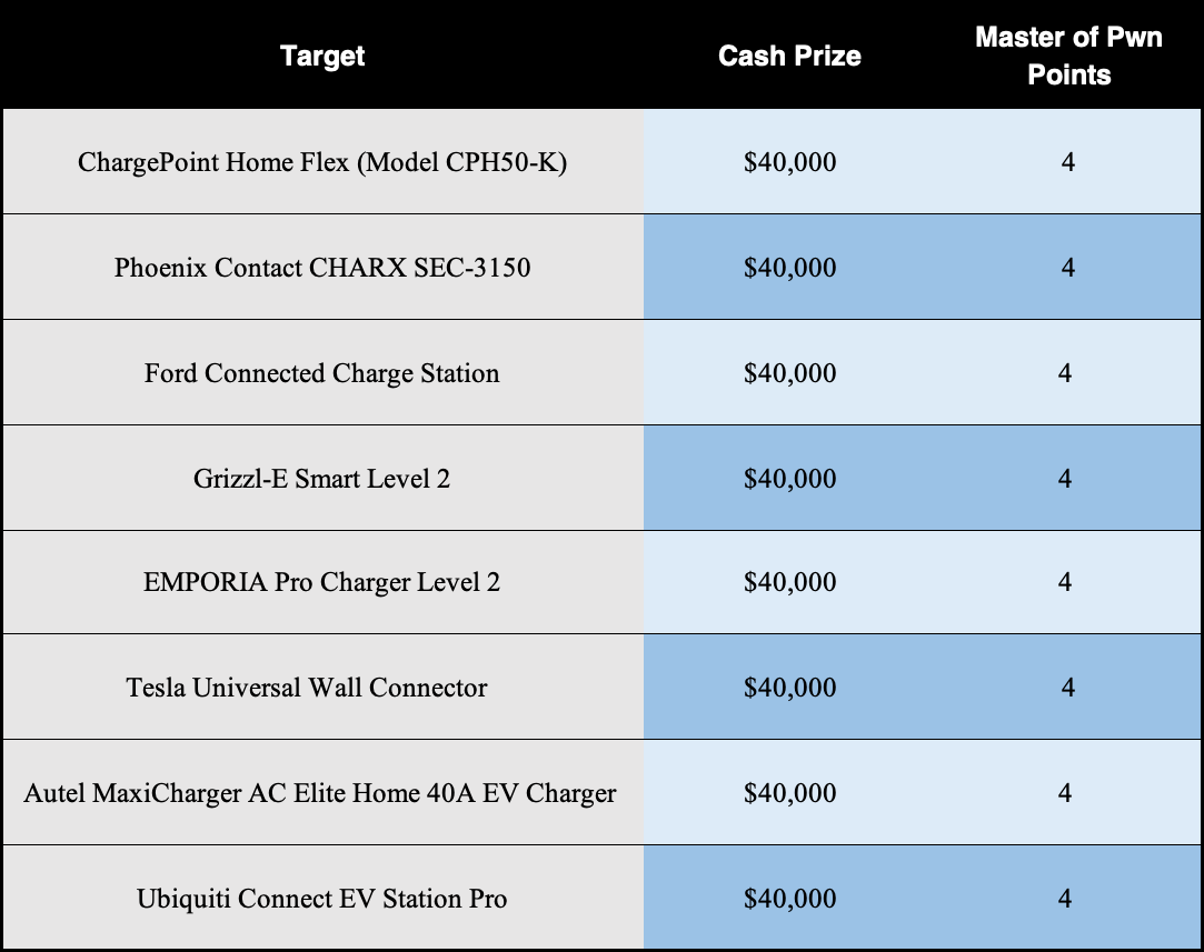 As we did last year, there are a couple of additional challenges you can add on to your attempt. The first extra challenge is a Charging Connector Protocol/Signal Manipulation attack. The entry must gain code execution on the EV Charger and the resulting payload must manipulate the protocol and/or signals being transmitted via the Charging Connector. If you can accomplish this, you’ll earn an extra $10,000 and 1 more Master of Pwn point. Really want a challenge? Then go for the Charging Connector Attack. For this one, the entry must originate from the Charging Connector and compromise the EV Charger. If you accomplish this one, it earns you an additional $20,000 and 2 more Master of Pwn points.