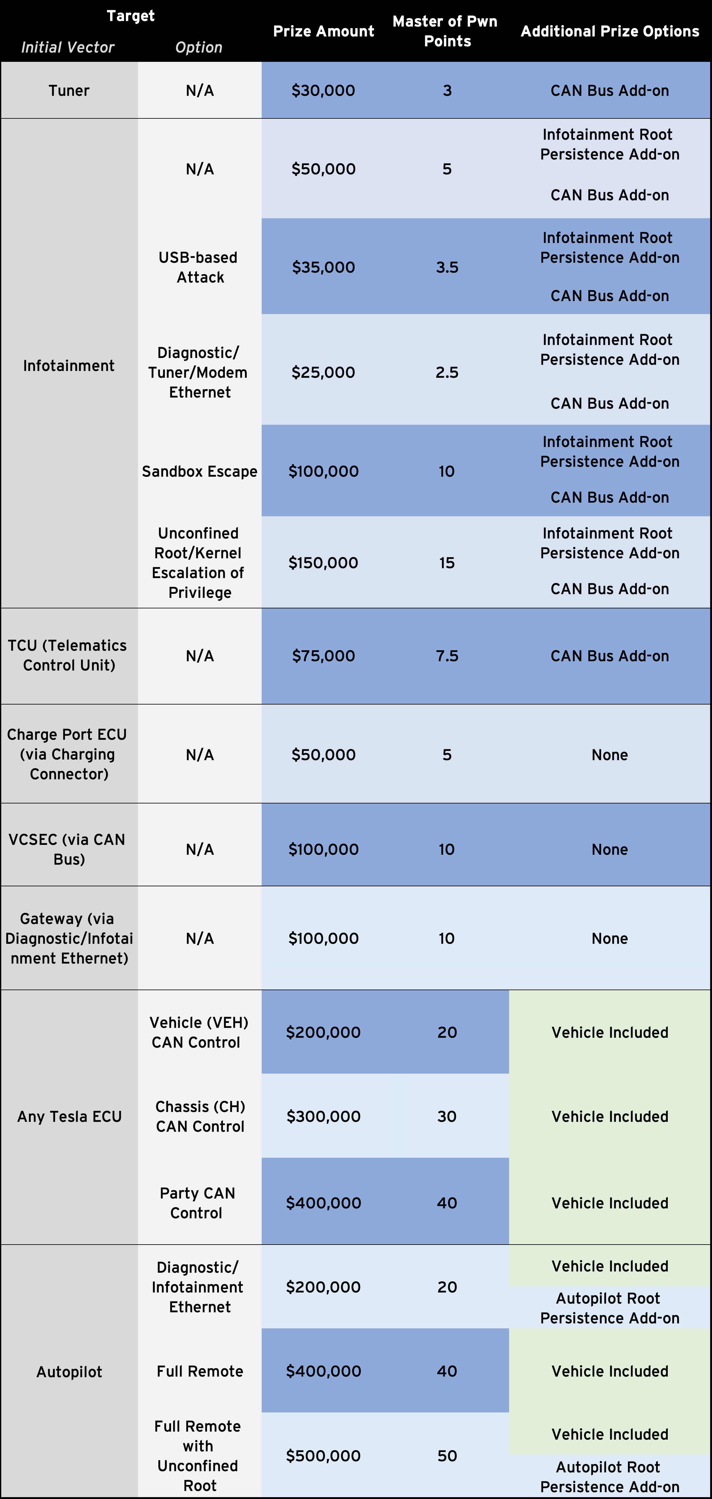 Since its introduction to Pwn2Own in 2019, the Tesla category has always been a highlight, with some of the most innovative research being demonstrated on the EV. At the inaugural Pwn2Own Automotive, the team from Synacktiv exploited it twice on their way to winning Master of Pwn. Contestants can register an entry against the Tesla Model 3/Y (Ryzen-based) equivalent bench top unit, and it wouldn’t surprise me if someone needs to run their exploits in an RF enclosure to prevent interference with vehicles that might be driving by. Also note that while a Tesla is available as a prize, not every successful attempt will win the vehicle itself. Some targets will require you to exploit multiple subsystems to reach the selected target. The prize amount is based on where the final code execution occurs. Some of the targets have add-ons available, but to drive away in your new ride, you need to target one of the entries marked “Vehicle Included” in the table below. Also note that the targets have changed a bit this year to keep things interesting.