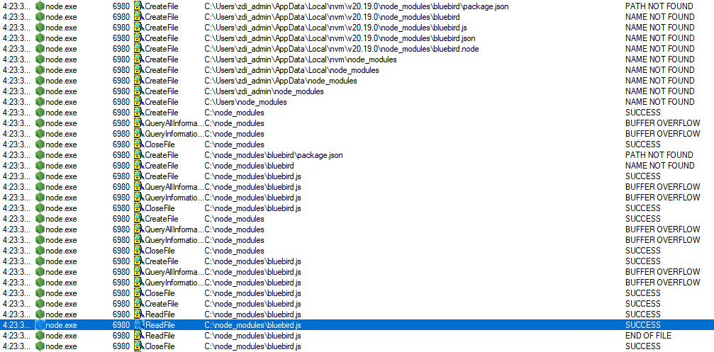Figure 6: Procmon log showing the package resolution behavior of Node.js via CVE-2026-0776