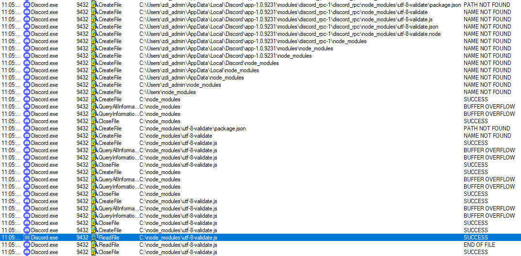 Discord does not ship with the utf-8-validate package. As a result, the following Procmon logs show the same behavior as Case 1. Anytime Discord is launched, the attacker controlled C:\node_modules\utf-8-validate.js is executed.